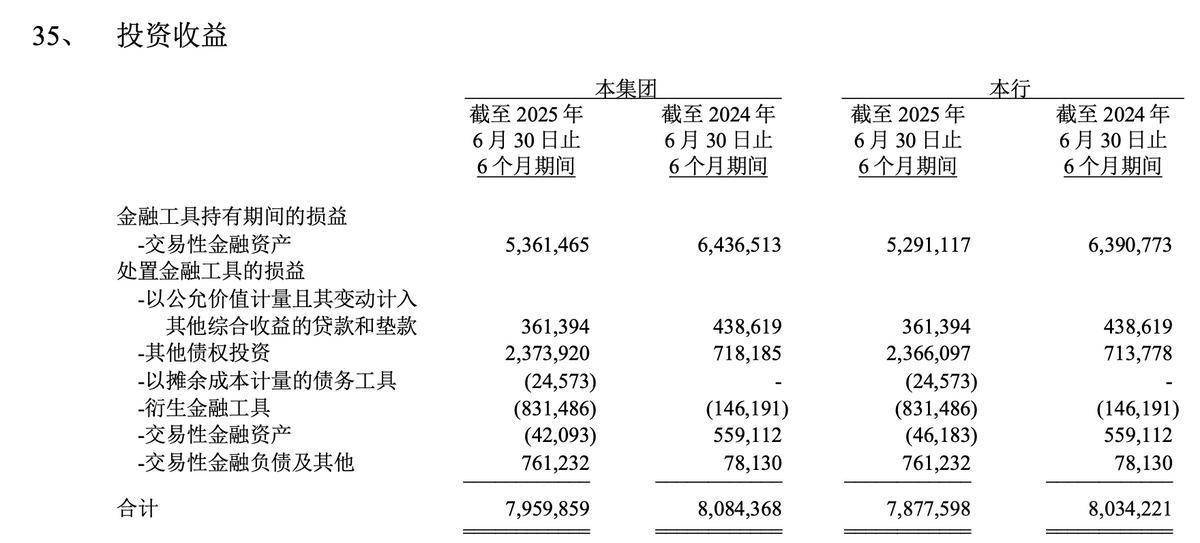 而在投资收益中,江苏银行除了“其他债券投资”这个科目增长外,其余科目都有所下滑。2025年上半年,该行的其他债券投资收益为23.74亿元,同比增长230.64%。在下降的科目中,金融工具持有期间的损益-交易性金融资产收益为53.61亿元,同比减少10.75亿元;衍生金融工具收益减少8.31亿元。